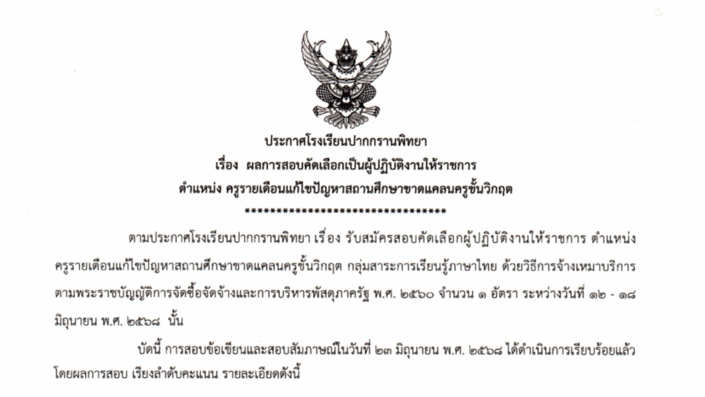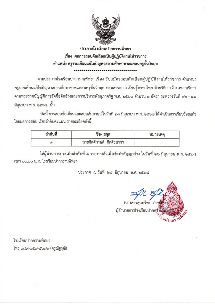 ประกาศรับสมัครประกาศโรงเรียนปากกรานพิทยาเรื่อง ผลสอบคัดเลือกเป็นผู้ปฏิบัติงานให้ราชการตำแหน่ง ครูรายเดือนแก้ไขปัญหาสถานศึกษาขาดแคลนครูขั้นวิกฤต Posted on มิถุนายน 25, 2025มิถุนายน 26, 2025 by โรงเรียนปากกรานพิทยา 25 มิ.ย. โรงเรียนปากกรานพิทยา ขอขอบคุณ คณะเจ้าหน้าที่ศูนย์บรรเทาและป้องกันสาธารณะภัย องค์การบริหารส่วนตำบลปากกราน ที่ให้ความช่วยเหลือในการตัดกิ่งต้นไม้ภายในบริเวณโรงเรียน วันต่อต้านยาเสพติดโลก ประจำปี 2568