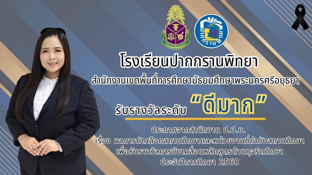 รางวัลระดับ “ดีมาก” จากสำนักงาน ป.ป.ช.เรื่อง ผลการคัดเลือกสถานศึกษาและหน่วยงานที่กำกับสถานศึกษา เพื่อรับรางวัลการขับเคลื่อนหลักสูตรด้านทุจริตศึกษา ประจำปีการศึกษา 2568