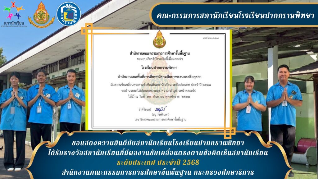 ผลงานนักเรียนรางวัลสภานักเรียนที่มีผลงานขับเคลื่อนตรงตามข้อคิดเห็นสภานักเรียน ระดับประเทศ ประจำปี 2568 สำนักงานคณะกรรมการการศึกษาขั้นพื้นฐาน กระทรวงศึกษาธิการ Posted on ตุลาคม 12, 2025พฤศจิกายน 25, 2025 by โรงเรียนปากกรานพิทยา 12 ต.ค. โรงเรียนปากกรานพิทยา รางวัลระดับยอดเยี่ยม ลำดับที่ 3 การถอดบทเรียนการสร้างนวัตกรรมการสอนที่มุ่งสู่ Soft Power ภายใต้รูปแบบการสอนเชิงรุกของโรงเรียนในสังกัด สพม.พระนครศรีอยุธยา กำหนดการ เปิดภาคเรียนที่ 2 ปีการศึกษา 2568